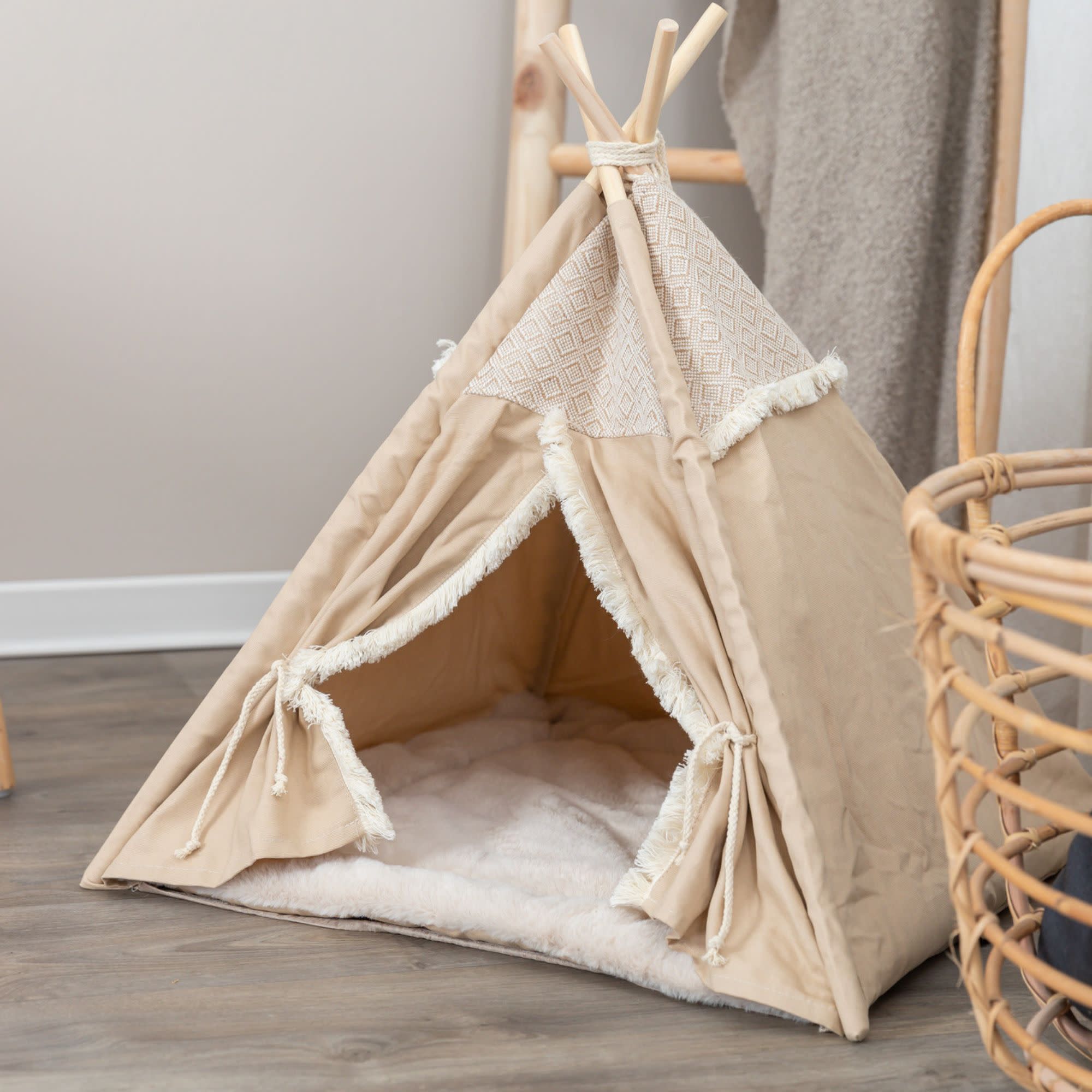 The TRIXIE Boho Tipi will provide great comfort and seclusion for your cat to relax. This cat retreat combines the best of both worlds: a peaceful hideaway and stylish furniture to compliment any decor. Outfitted in trendy neutral Boho chic jute/cotton mix fabrics, this bed will have your cat fast asleep with these laid-back vibes. The inner bed reversible cushion provides an extra thick bottom for your pet’s comfort and support. An anti-skid base keeps the tipi from sliding around. Suitable for cats and small dogs to take the purr-fect nap.