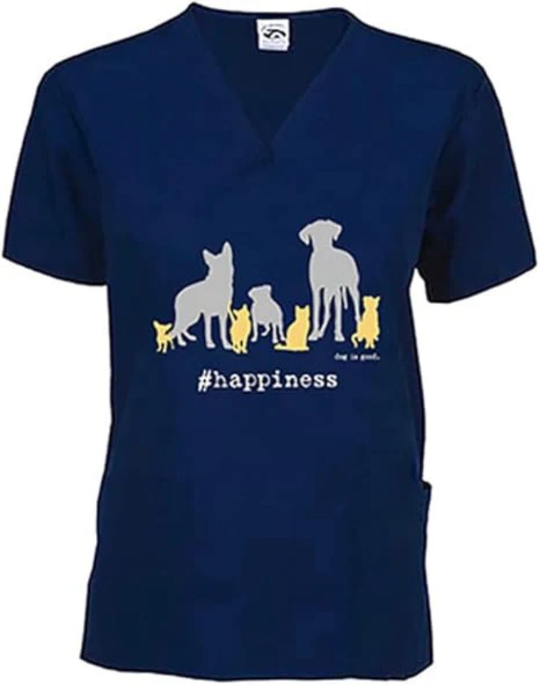 Show off your love for animals with our vibrant, navy-colored #happiness scrub top, designed for comfort and style. Crafted from a high-quality 55/45 cotton-poly blend, this top features durable fabric and expert sewing to keep up with your busy day. Its loose-fitting v-neck design, side slits, and two front pockets ensure you stay both stylish and practical.
