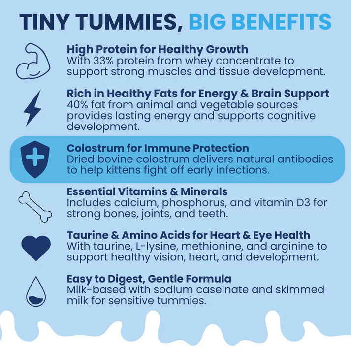 A premium milk replacer formula designed to meet the nutritional requirements of nursing puppies and kittens. At least 20% of the protein and 15% of the fat comes from dried whole goat milk. This formula also includes dried bovine colostrum which is a source of IgG to support immune function.