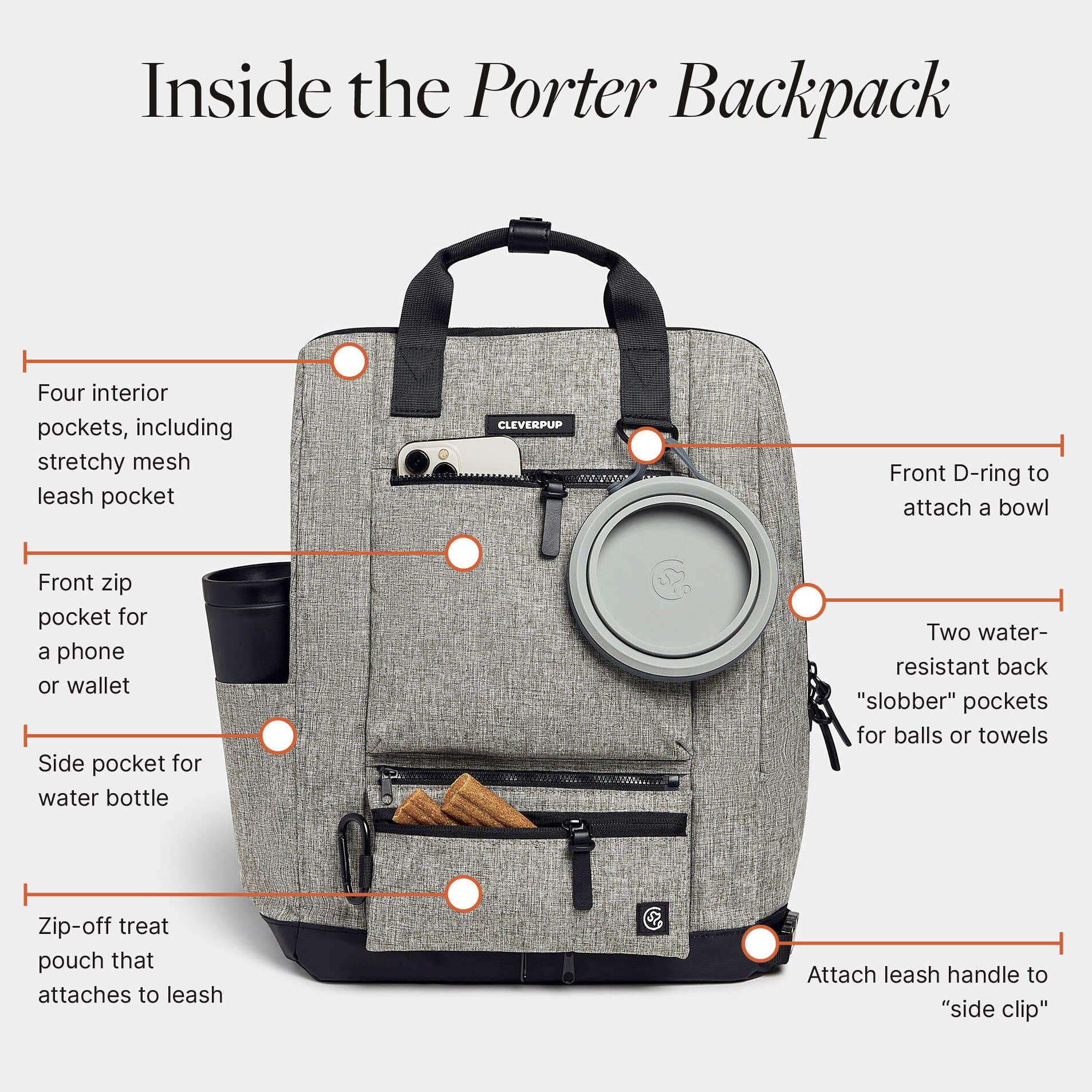 Five exterior pockets: Two water-resistant Slobber Pockets with food-safe linings for damp tennis balls or towels, A treat pouch with food-safe lining that zips off and attaches to your belt loop or leash for on-the-go training, Secure front zip pocket for phone and valuables, Water bottle holder.