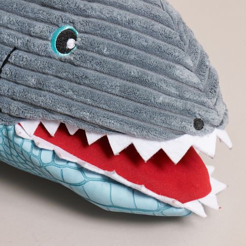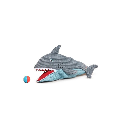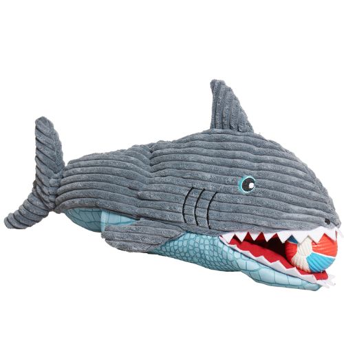Finn is crafted in soft gray corduroy plush, featuring a bright rubbery light blue belly, oversized red mouth, and bold white shark teeth. Inside his jaw sits a squeaker that activates when you “CHOMP” the puppet—dogs absolutely love the playful interaction!