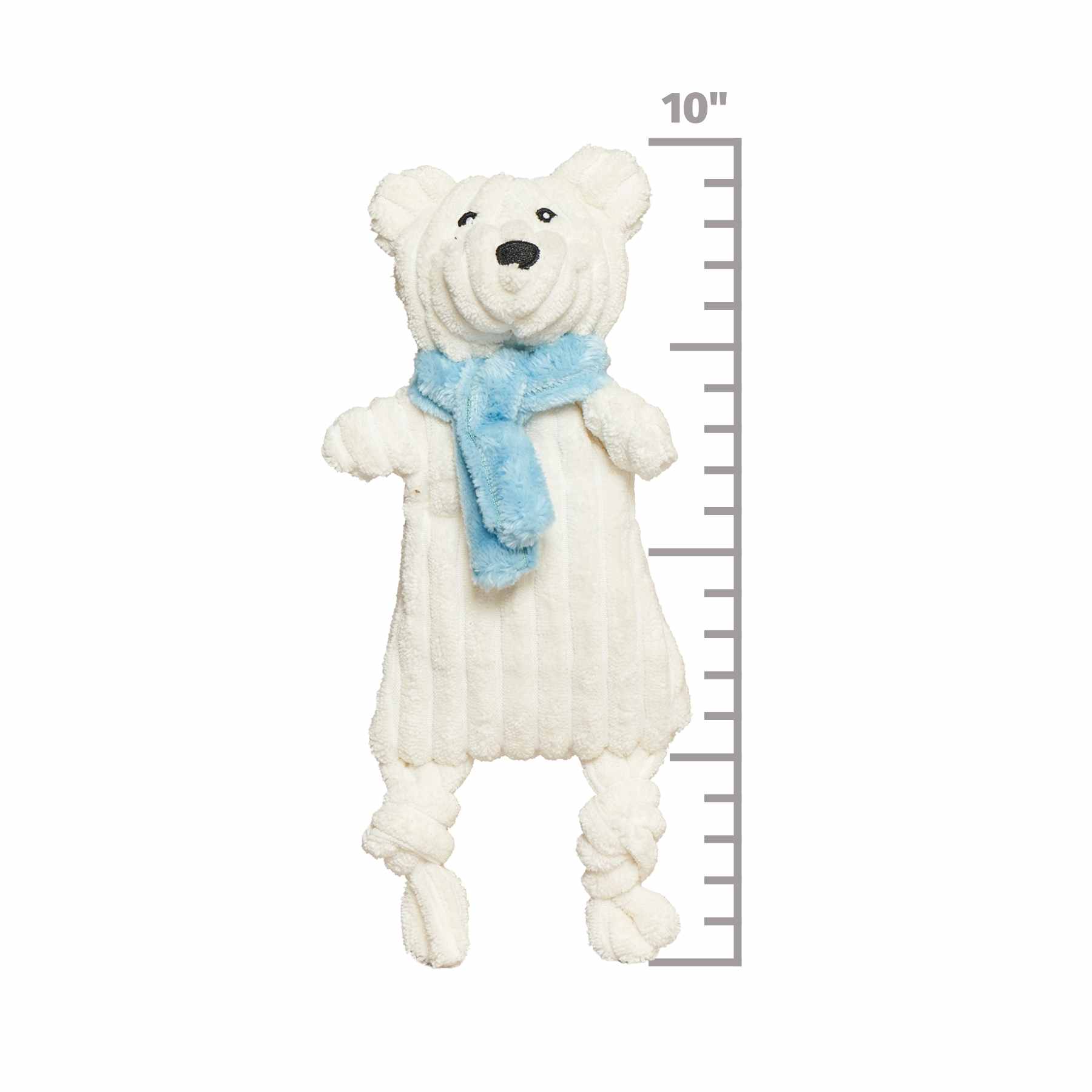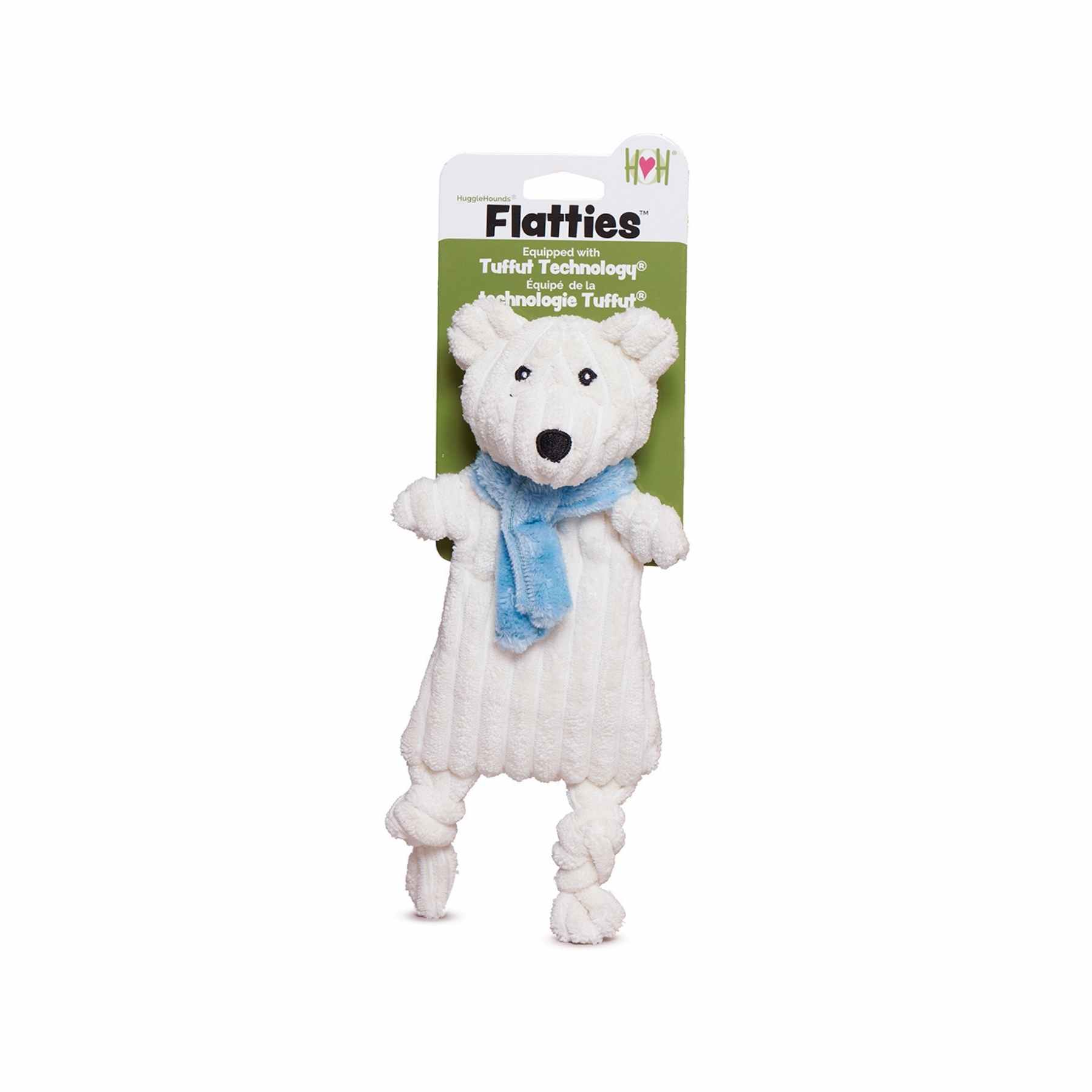 Meet SnuggleBear, the sweetest, coziest member of our HuggleFlatties™ family! Made from ultra‑soft cream plush with knotted limbs and a charming blue winter scarf, SnuggleBear brings gentle, year‑round cuddle appeal with the classic flop and shake dogs love.