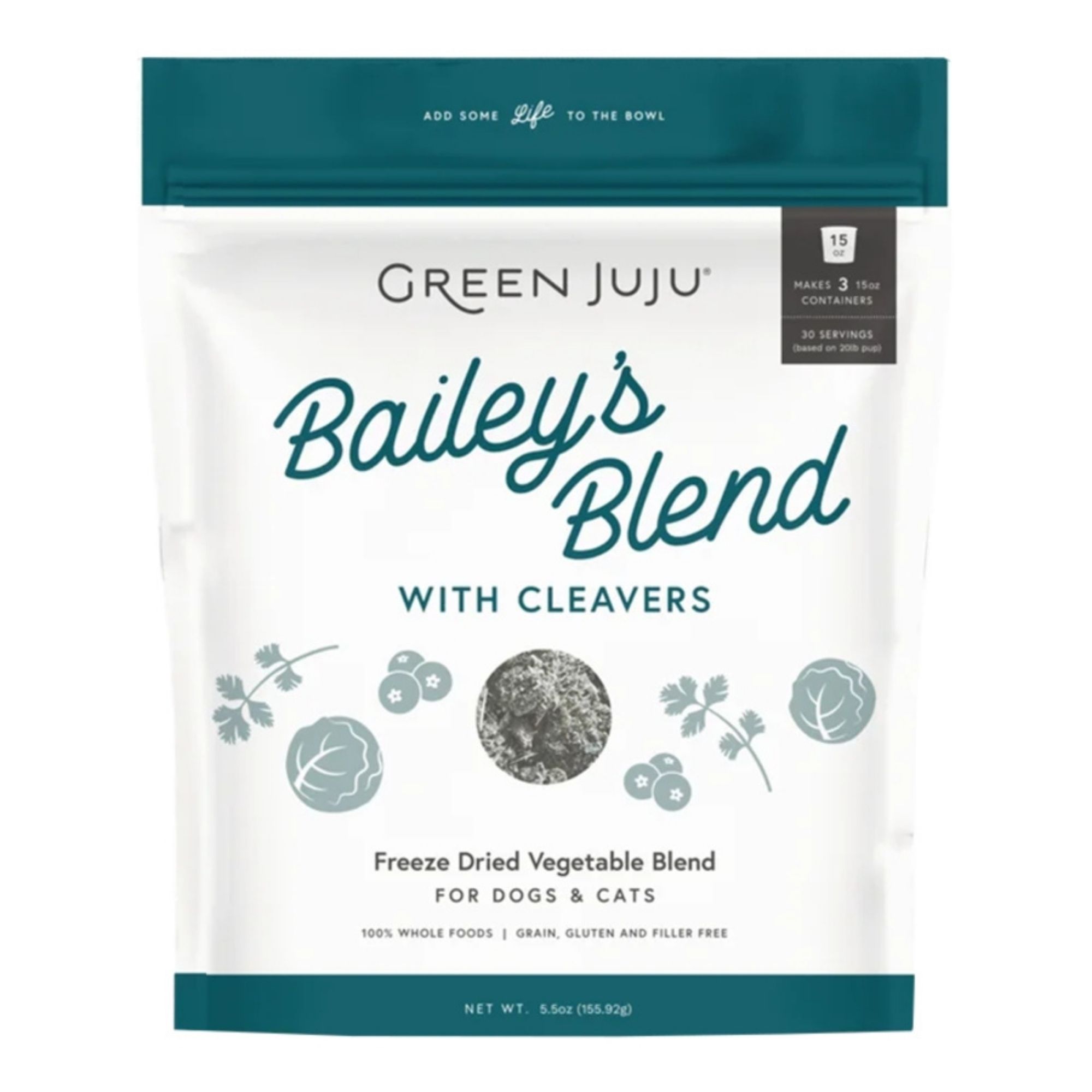 A detoxifying raw nutrient boost for dogs and cats, Freeze-Dried Bailey’s Blend with Cleavers is a fresh twist on our signature blend.