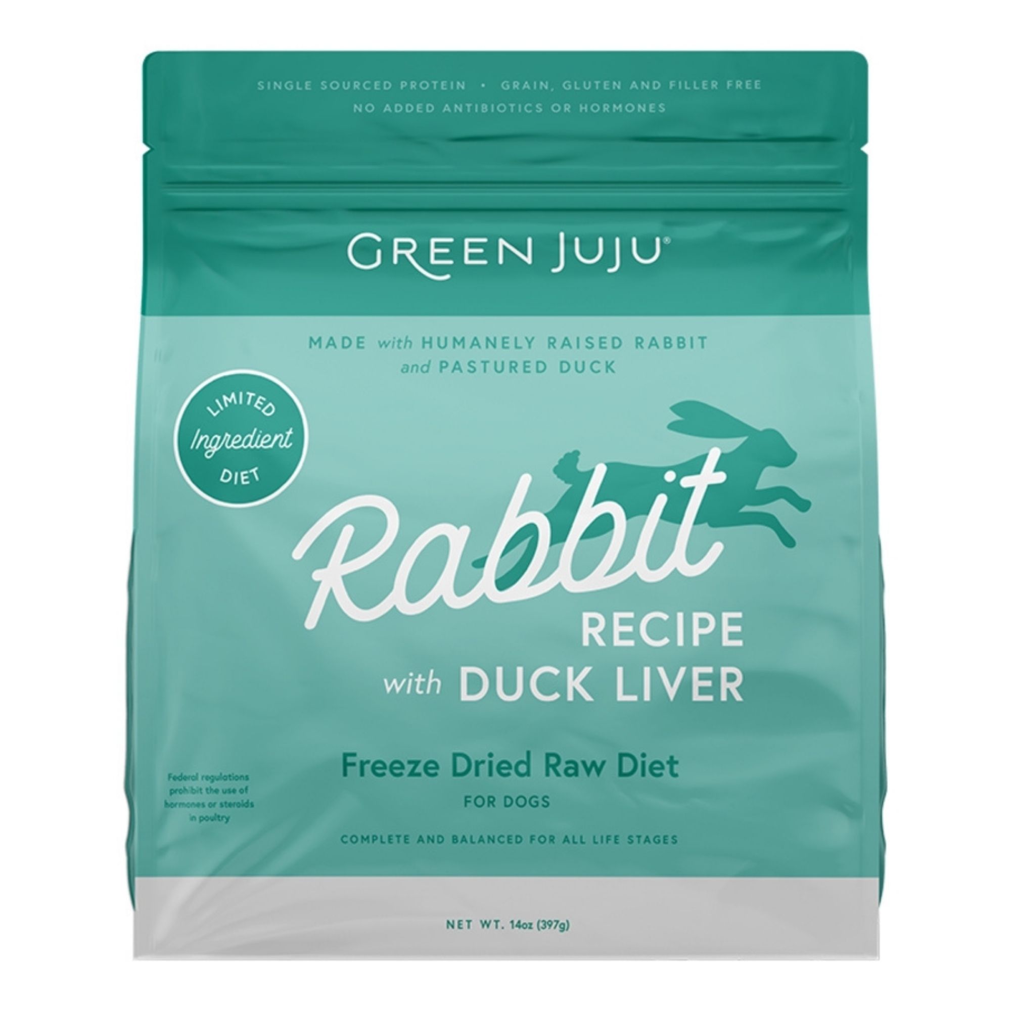 • Freeze-dried raw rabbit & duck liver recipe with organic greens & kelp