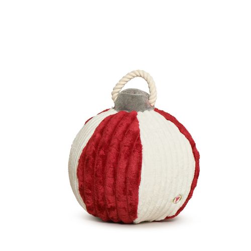Deck the paws with playful cheer! Our Jolly Red & White Orna‑mutt Plush Ball brings festive fun to every dog’s holiday season. Shaped like a classic Christmas ornament, this plush ball features alternating red and white wide‑wale corduroy panels, a soft silver plush ornament cap, and a durable rope loop for easy carrying and interactive play.