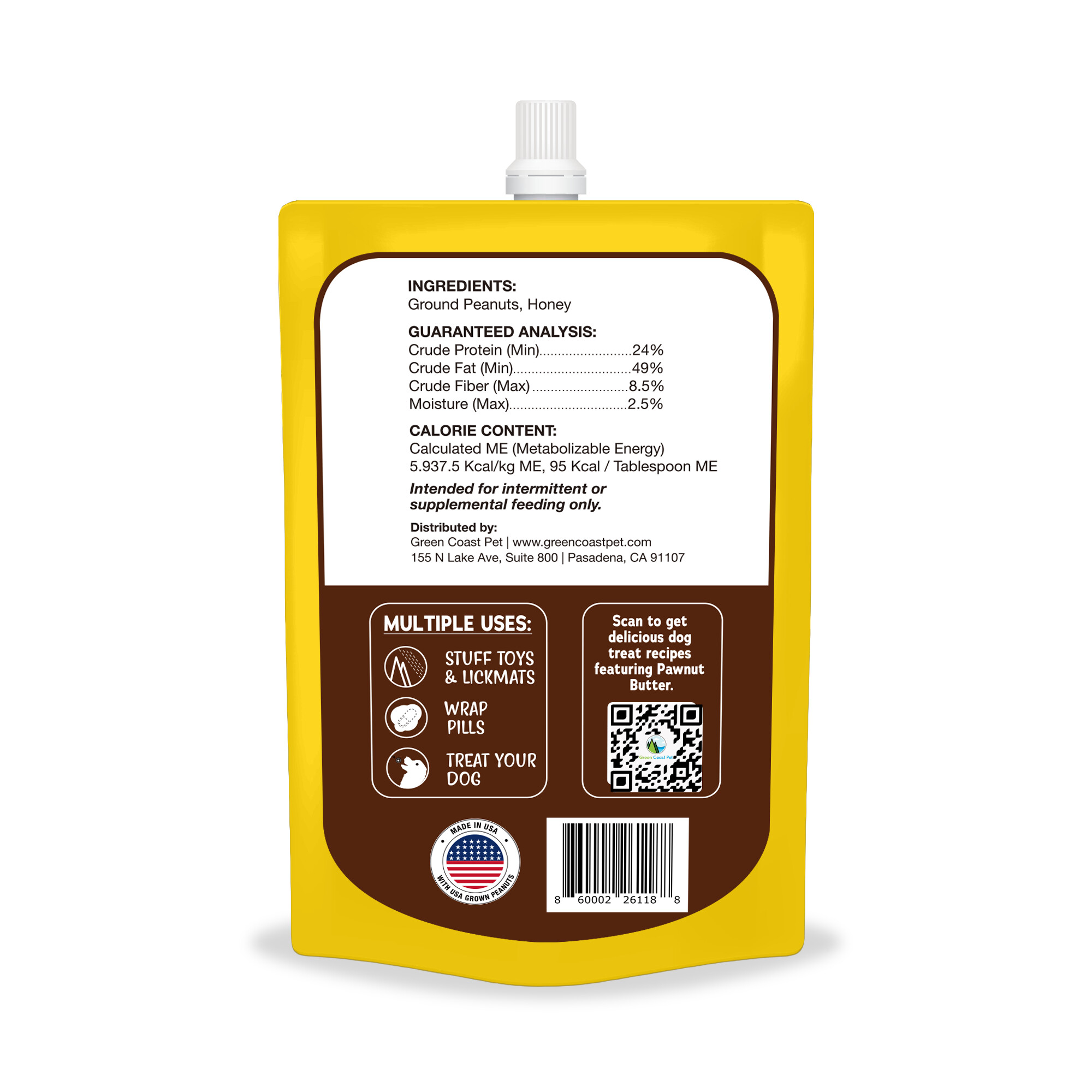We've put Green Coast Pet's famous Pawnut Butter BuzzyBee Recipe into a convenient 6 oz, resealable pouch for easy toy filling. Our BuzzyBee Recipe is just two ingredients Peanuts and Honey making it best peanut butter for dogs avaiable. It's a perfect treat to fill a toy, dental treat, fillable bone or lickmat. You can even use Pawnut Butter to bake safe peanut butter cookies for your dog. Pawnut butter is also a great food additive that makes breakfast, lunch or dinner time extra special and tasty. Pawnut Butter is free of salt, sugar, preservatives, hydrogenated oils and xylitol.