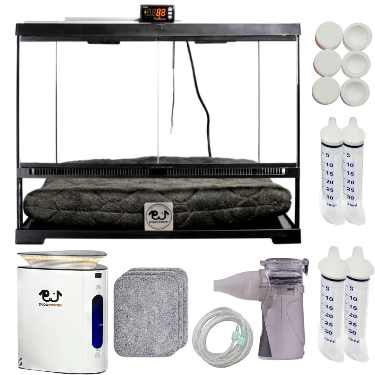 Includes 1 large Puppywarmer Incubator, 1 dust cover, 3pc fleece inserts, 4 feeding nipple syringes, 1 Standard series oxygen concentrator, pack of 2 oxygen line replacements, pack of 6 oxygen filter and 1 rechargeable handheld mesh nebulizer
