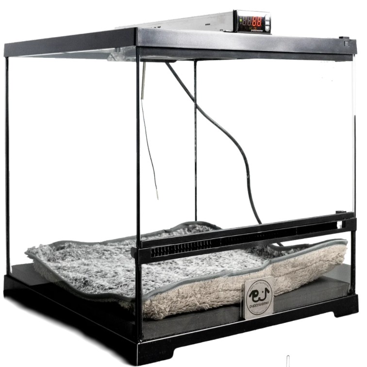 Puppywarmer Puppy Incubator 18"x18"x18" uses an infrared heater with encased insulation to reflect more infrared wavelengths to keep newborn puppies and kittens warm.