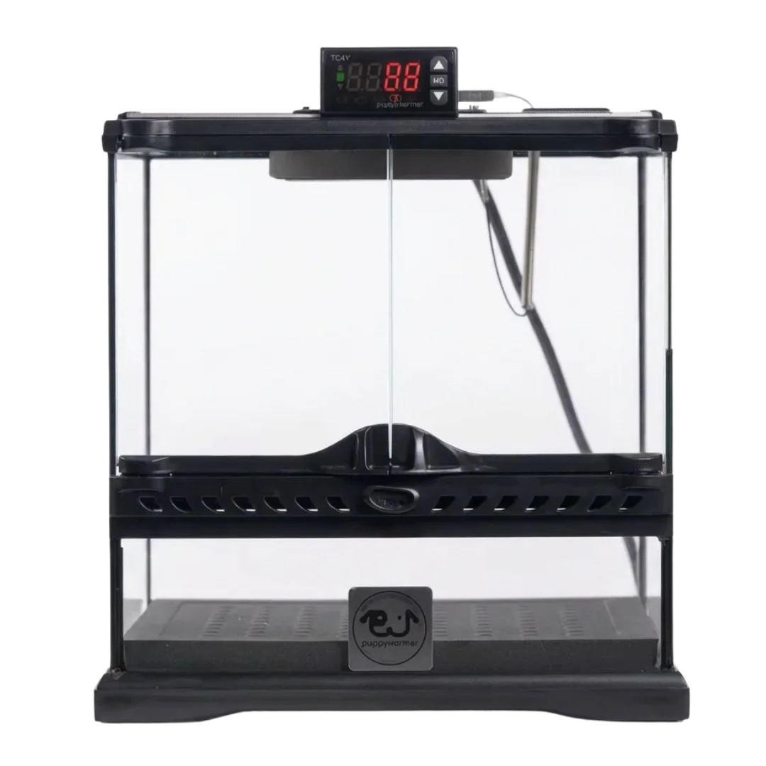 Puppywarmer Puppy Incubator 12"x12"x12" uses an infrared heater with encased insulation to reflect more infrared wavelengths to keep newborn puppies and kittens warm.