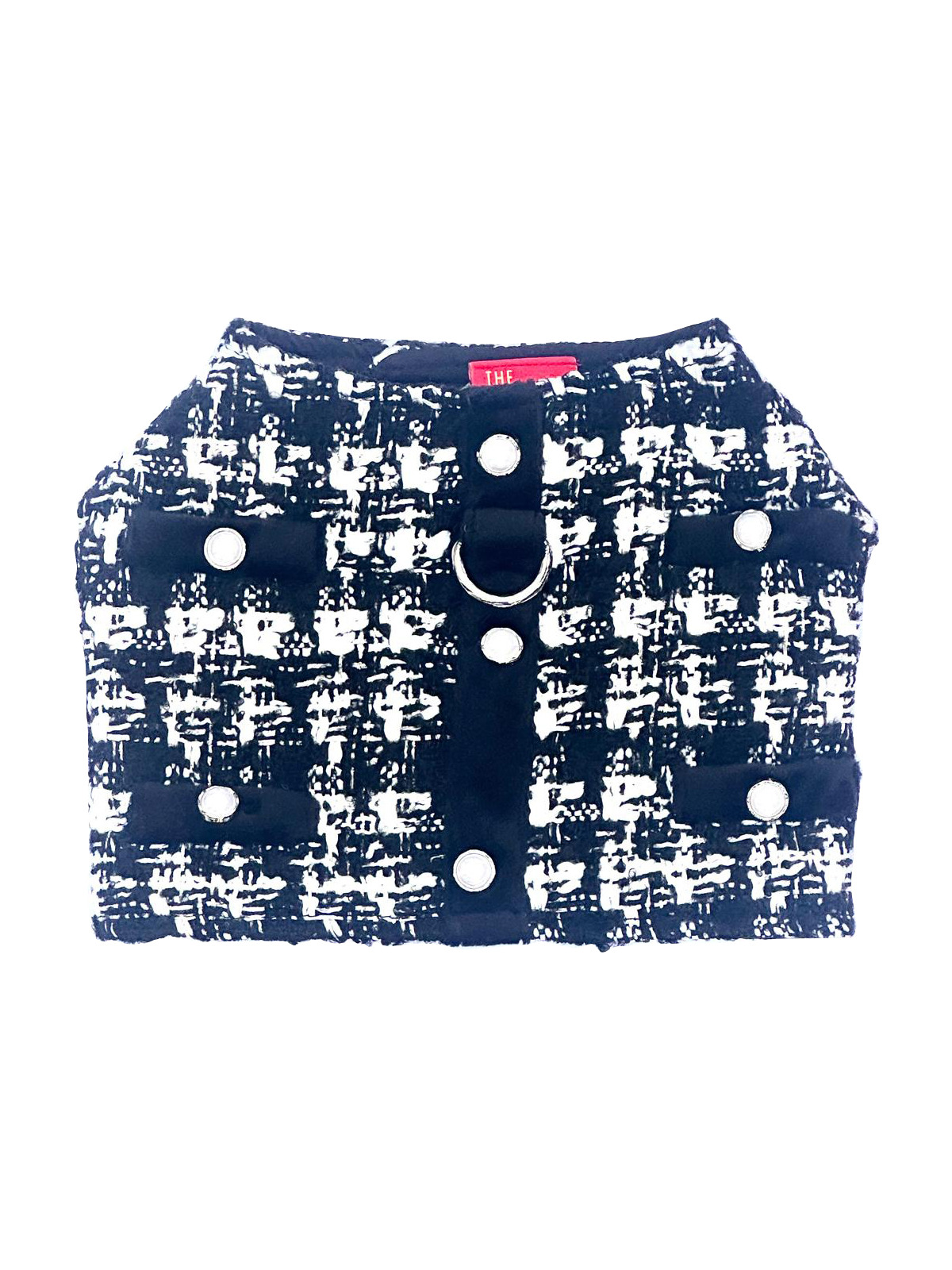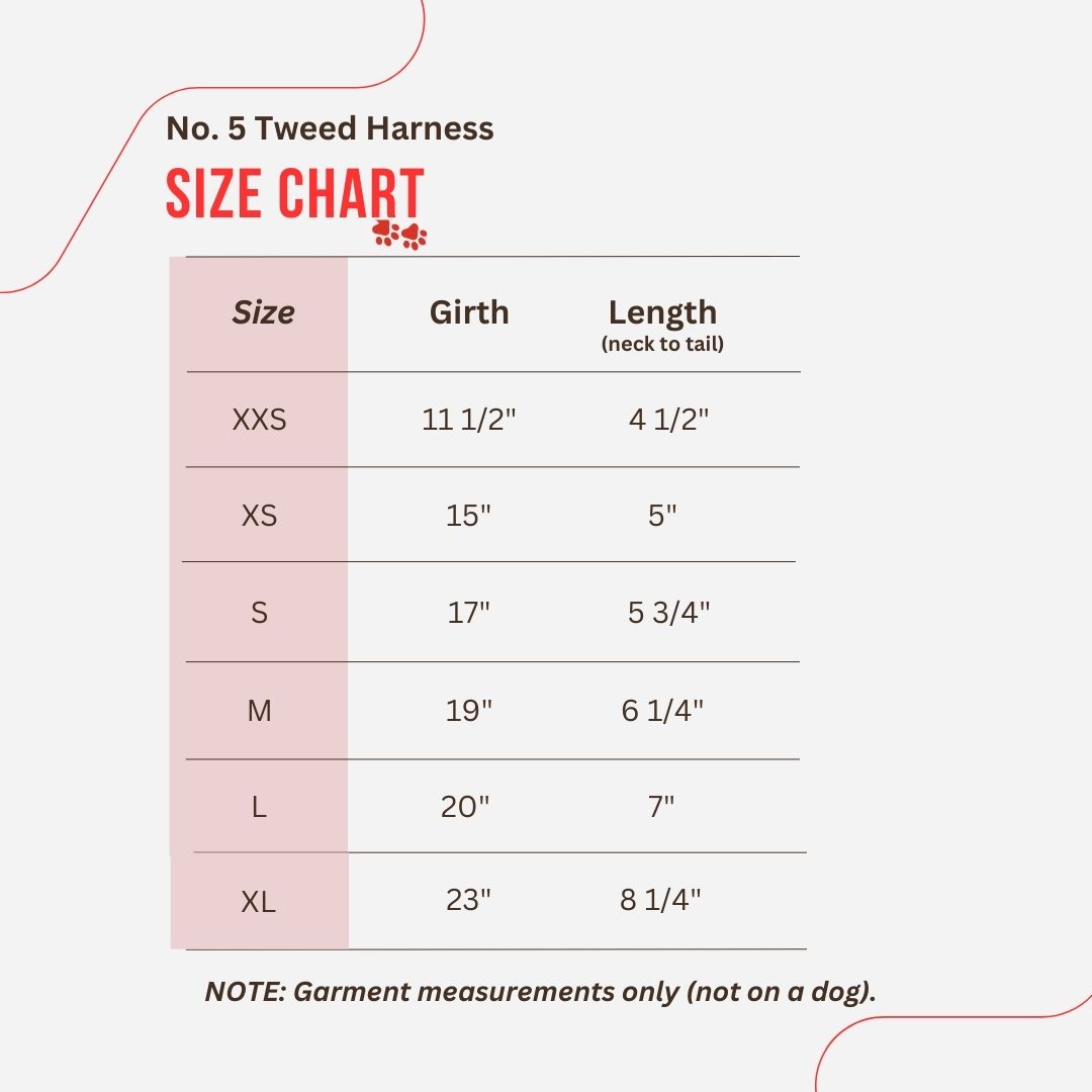Luxurious tweed harness designed to coordinate with our Tweed Dress collection. Features two faux velvet pockets, dual Velcro closures at chest and mid-body for a secure, adjustable fit, and a center back D-ring for leash attachment.