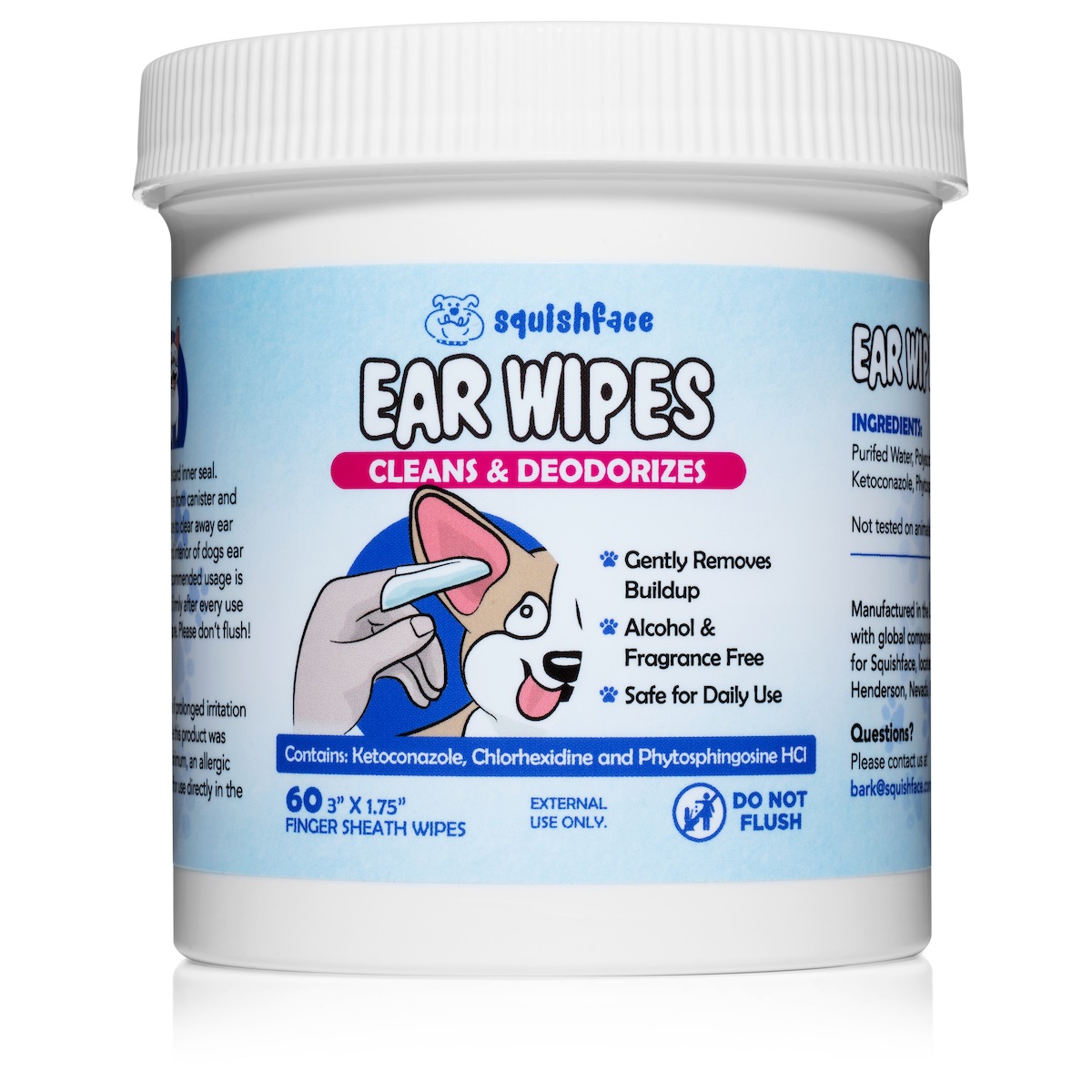Squishface Ear Wipes are convenient pre-moistened finger sheath wipes that allow you to get deep down into the hard-to-reach areas of your dog’s ear to help clean & deodorize! Odors and irritations are kept at bay, avoiding expensive vet bills. No more head shaking, scratching, pawing, or discomfort from infected ears!