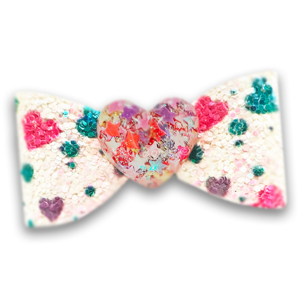 Love Bubble is a sweet and sparkly dog bow featuring a soft white glitter base sprinkled with colorful hearts and shimmer accents. The center showcases a dimensional bubble heart filled with floating confetti for a playful, eye-catching finish. Stiffened for extended wear; approx 2" wide.