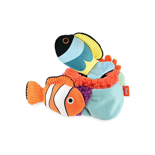 Includes one crinkly coral reef and two detachable squeaky fish toys