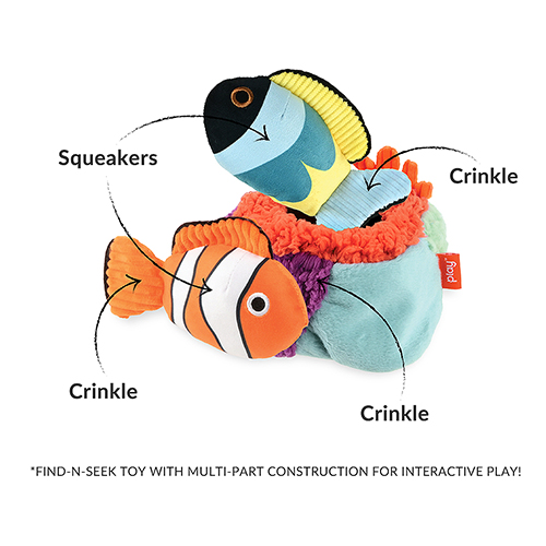 • Includes one crinkly coral reef and two detachable squeaky fish toys