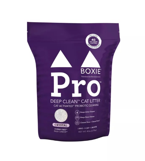 A non-toxic crystal cat litter with an added proprietary blend of Boxie probiotics and MicroDry Odor Absorption Crystals that provide self-cleaning properties and trap odors for over a month.