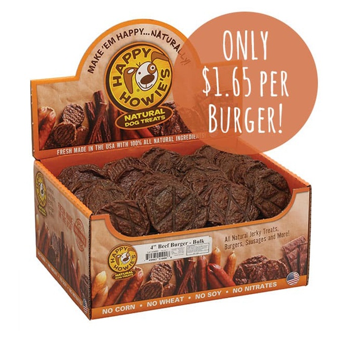 4-inch BEEF BURGERS Bulk (60 Count) Our premium beefy 4 Burger treats are slow-cooked with gluten-free rice flour and grass-fed cattle raised in the USA. These longer lasting patty treats are an excellent way to reward your large-breed dog that loves to chew.