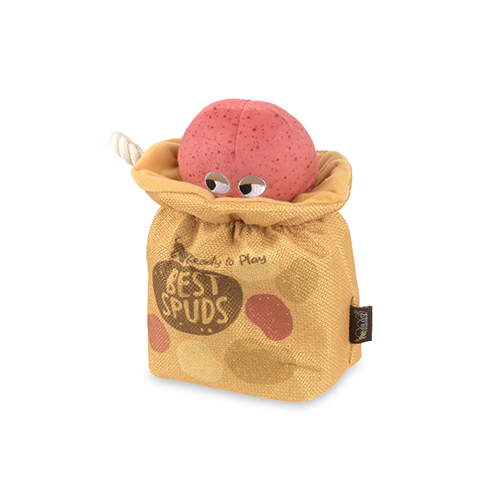 Includes two squeaky plush potatoes inside a crinkly play sack for interactive 3-in-1 fun
