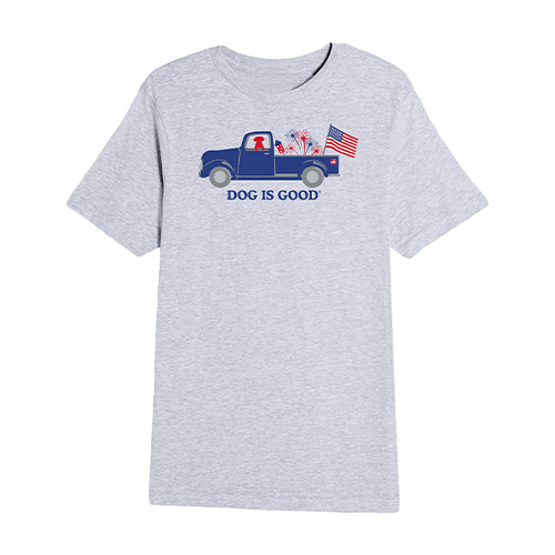 Red, white, and ready to roll. The Patriotic Vintage Truck tee brings retro Americana vibes with a dog-loving twist. Featuring a classic blue pickup decked out with fireworks, an American flag, and—of course—your loyal dog riding shotgun, this heather gray tee is a summertime essential. Made with soft, breathable fabric and a unisex fit, it’s perfect for Fourth of July barbecues, parades, or just repping your country and your canine all summer long. Details: