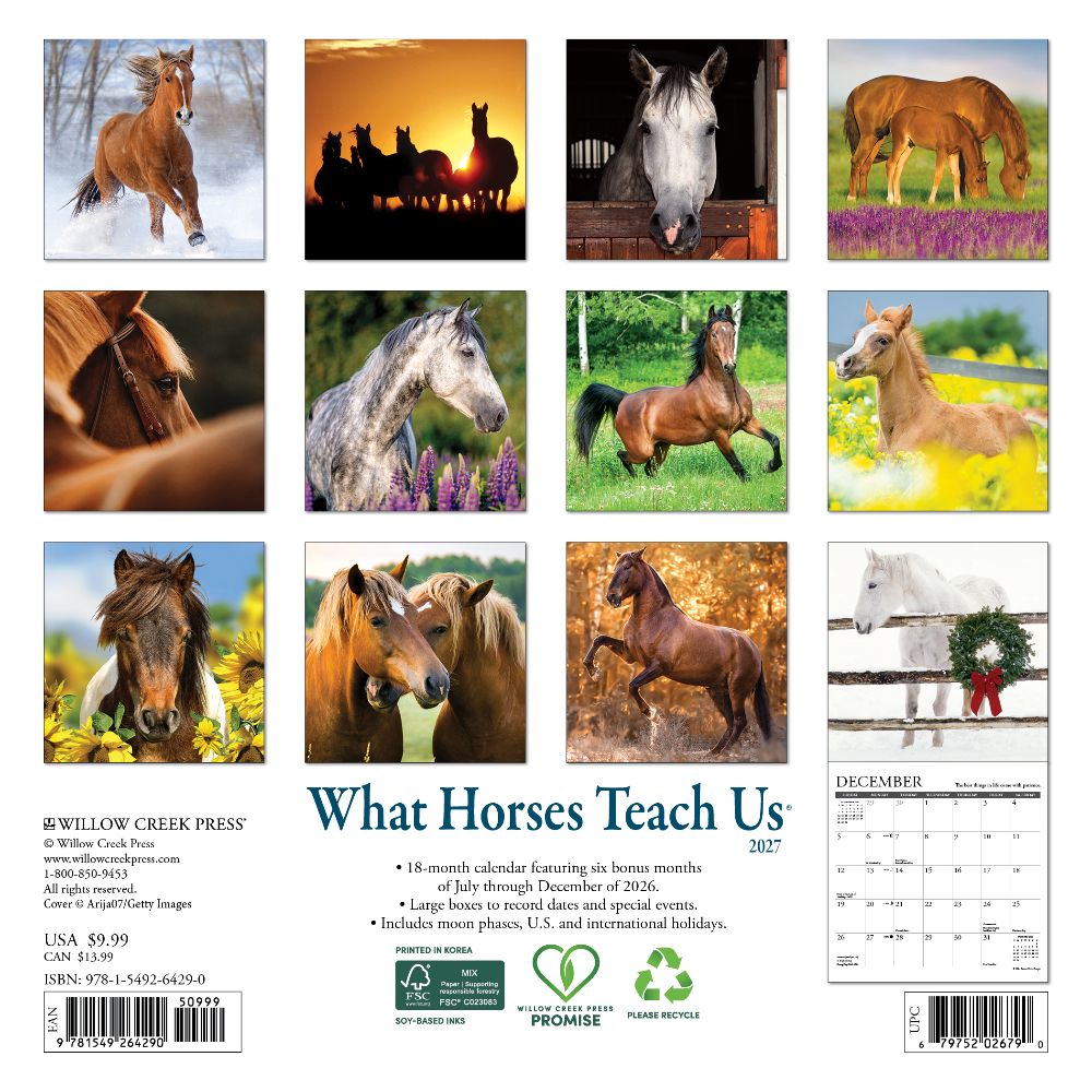 EQUINE WISDOM – Revel in twelve spectacular horse photographs, each paired with a timeless life lesson. Discover the path to a simpler, more joyful existence, inspired by the majesty and wisdom of these magnificent creatures. PLAN IN STYLE – Our 7” x 7” wall calendars are the perfect fit for small spaces and the modern workplace. Six bonus months from 2026 (July to December) provide a smooth transition into 2027, while monthly grids offer ample room for jotting notes and planning the year ahead. PICTURE-PERFECT QUALITY – Enjoy crisp, colorful monthly photos that double as wall art for your home, office, or school. Plus, it's printed with soy-based inks on high-quality FSC certified paper for smooth writing. SCHEDULE WITH EASE – Be inspired, take notes, remember dates, track appointments, and manage family activities with ease.