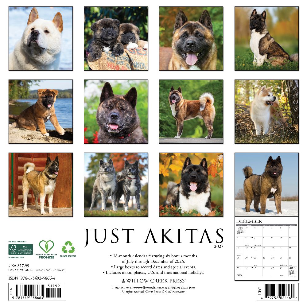 NOBLE BREED – Originally from Japan, Akitas are strong, dignified, and loyal dogs with a natural protective instinct. The Akitas 2027 Wall Calendar features stunning photographs of these majestic dogs, from playful pups to regal adults. The Akita’s beauty and character make this calendar a perfect addition to any dog lover’s home or office. PLAN IN STYLE – Stay organized with our 12” x 12” monthly wall calendars, the perfect fit for any home or modern office. Six bonus months from July to December 2026 provide a smooth transition into the new year, while large monthly grids from January through December 2027 offer ample room for jotting notes and planning. PICTURE-PERFECT QUALITY – Printed with soy-based inks on high-quality FSC-certified paper, our large format 12” x 12” wall calendars offer smooth writing, crisp readability, and vibrant imagery, making them a welcome accent to any space. EFFORTLESS SCHEDULING – Enjoy ample space to note events, track appointments, and easily organize activities. Manage busy schedules at-a-glance with clearly noted moon phases (CST), holidays, and observances.