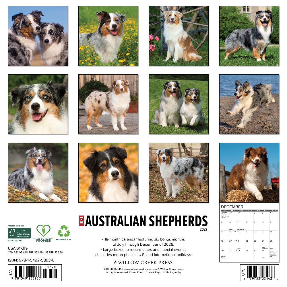 RANCH DOG – Known for their boundless energy, intelligence, and trainability, Australian Shepherds are a breed that captures hearts and minds alike. The Australian Shepherds 2027 Wall Calendar is a tribute to these remarkable dogs, showcasing their playful spirit and hardworking nature. From cherished pets to valued working dogs, Aussies are always ready to herd, play, and please their owners. PLAN IN STYLE – Stay organized with our 12” x 12” monthly wall calendars, the perfect fit for any home or modern office. Six bonus months from July to December 2026 provide a smooth transition into the new year, while large monthly grids from January through December 2027 offer ample room for jotting notes and planning. PICTURE-PERFECT QUALITY – Printed with soy-based inks on high-quality FSC-certified paper, our large format 12” x 12” wall calendars offer smooth writing, crisp readability, and vibrant imagery, making them a welcome accent to any space. EFFORTLESS SCHEDULING – Enjoy ample space to note events, track appointments, and easily organize activities. Manage busy schedules at-a-glance with clearly noted moon phases (CST), holidays, and observances.
