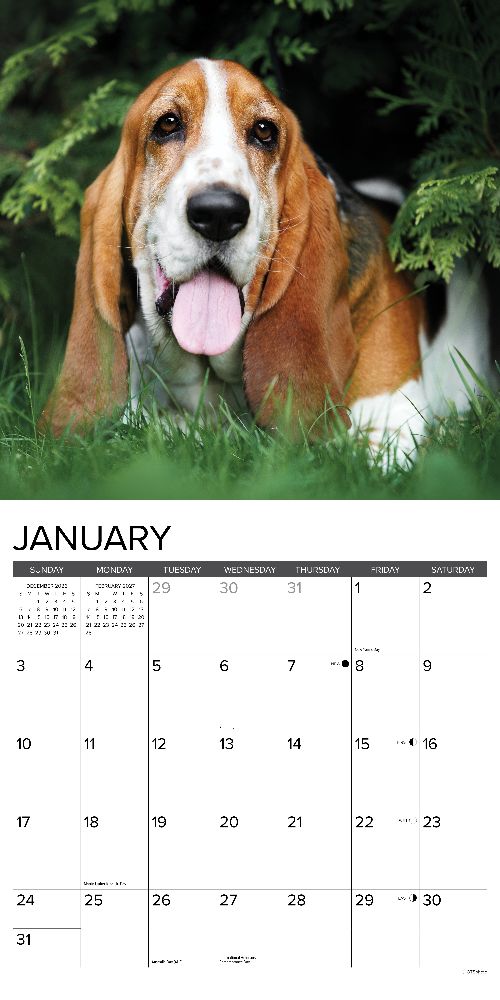 DROOPY-EARED CHARM - This delightful 2027 wall calendar is full of lovable Basset Hounds showcasing their signature long ears, soulful eyes, and relaxed personalities. A must-have for fans of this iconic breed, each month captures their quirky and endearing spirit. PLAN IN STYLE – Stay organized with our 12” x 12” monthly wall calendars, the perfect fit for any home or modern office. Six bonus months from July to December 2026 provide a smooth transition into the new year, while large monthly grids from January through December 2027 offer ample room for jotting notes and planning. PICTURE-PERFECT QUALITY – Printed with soy-based inks on high-quality FSC-certified paper, our large format 12” x 12” wall calendars offer smooth writing, crisp readability, and vibrant imagery, making them a welcome accent to any space. EFFORTLESS SCHEDULING – Enjoy ample space to note events, track appointments, and easily organize activities. Manage busy schedules at-a-glance with clearly noted moon phases (CST), holidays, and observances.
