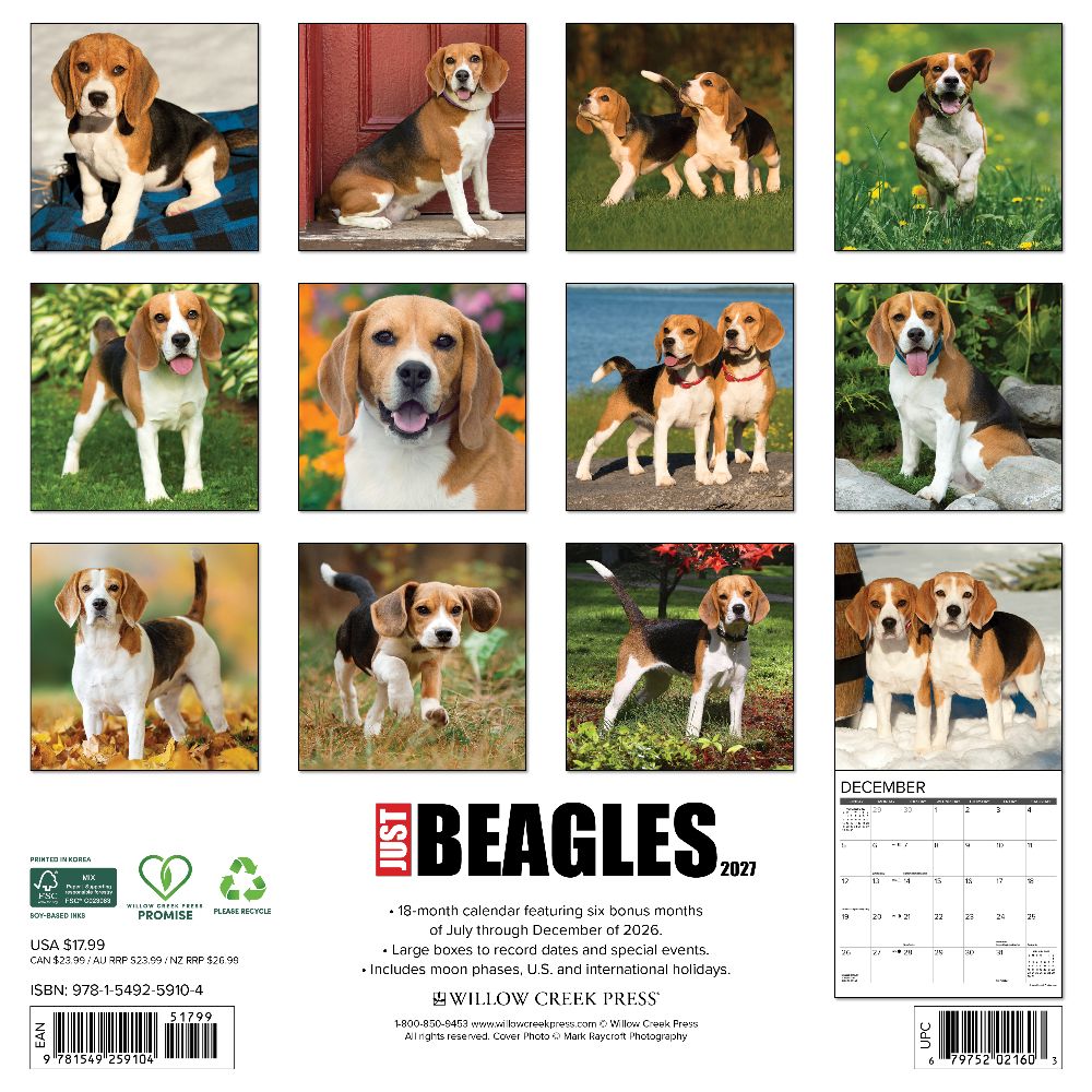 BEAGLE DEVOTION – Celebrate the charm, loyalty, and playful spirit of one of America’s favorite breeds with this 2027 wall calendar featuring stunning full-color images of Beagles in every season. Whether posing sweetly or bounding through nature, these lovable dogs steal the spotlight all year long. PLAN IN STYLE – Stay organized with our 12” x 12” monthly wall calendars, the perfect fit for any home or modern office. Six bonus months from July to December 2026 provide a smooth transition into the new year, while large monthly grids from January through December 2027 offer ample room for jotting notes and planning. PICTURE-PERFECT QUALITY – Printed with soy-based inks on high-quality FSC-certified paper, our large format 12” x 12” wall calendars offer smooth writing, crisp readability, and vibrant imagery, making them a welcome accent to any space. EFFORTLESS SCHEDULING – Enjoy ample space to note events, track appointments, and easily organize activities. Manage busy schedules at-a-glance with clearly noted moon phases (CST), holidays, and observances.