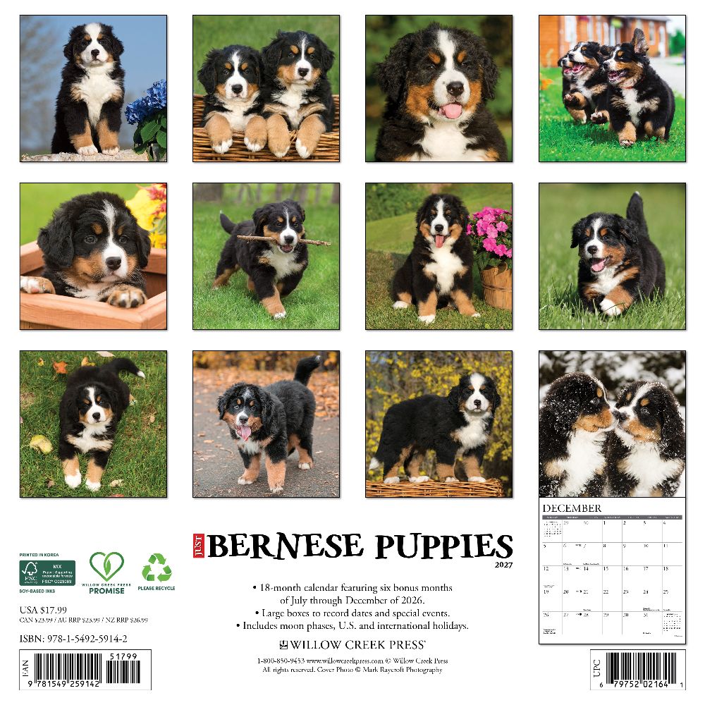 FLUFFY BUNDLES OF JOY – This 2027 wall calendar features irresistibly adorable Bernese Mountain Dog puppies at play, at rest, and in full fluff mode. A heartwarming gift for dog lovers, each month is packed with puppy charm and sweet, soulful eyes. PLAN IN STYLE – Stay organized with our 12” x 12” monthly wall calendars, the perfect fit for any home or modern office. Six bonus months from July to December 2026 provide a smooth transition into the new year, while large monthly grids from January through December 2027 offer ample room for jotting notes and planning. PICTURE-PERFECT QUALITY – Printed with soy-based inks on high-quality FSC-certified paper, our large format 12” x 12” wall calendars offer smooth writing, crisp readability, and vibrant imagery, making them a welcome accent to any space. EFFORTLESS SCHEDULING – Enjoy ample space to note events, track appointments, and easily organize activities. Manage busy schedules at-a-glance with clearly noted moon phases (CST), holidays, and observances.
