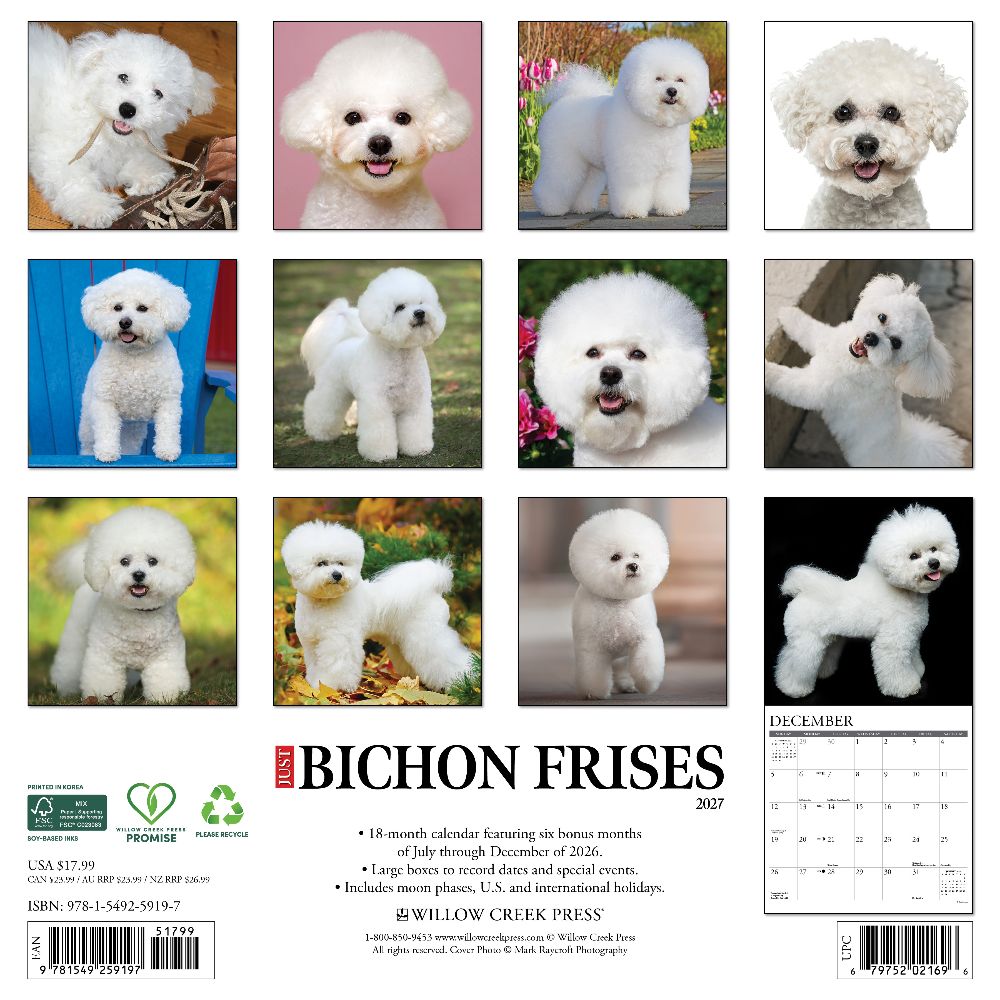 CLOUDS OF CUTENESS – This 2027 wall calendar celebrates the charm and elegance of the Bichon Frise with a year of delightful portraits featuring their fluffy coats, round faces, and sweet expressions. A perfect pick for fans of this lovable, cheerful breed. PLAN IN STYLE – Stay organized with our 12” x 12” monthly wall calendars, the perfect fit for any home or modern office. Six bonus months from July to December 2026 provide a smooth transition into the new year, while large monthly grids from January through December 2027 offer ample room for jotting notes and planning. PICTURE-PERFECT QUALITY – Printed with soy-based inks on high-quality FSC-certified paper, our large format 12” x 12” wall calendars offer smooth writing, crisp readability, and vibrant imagery, making them a welcome accent to any space. EFFORTLESS SCHEDULING – Enjoy ample space to note events, track appointments, and easily organize activities. Manage busy schedules at-a-glance with clearly noted moon phases (CST), holidays, and observances.