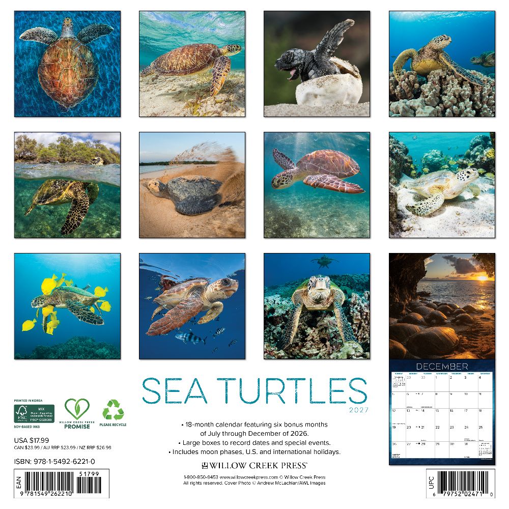 OCEAN WONDERS – The Sea Turtles 2027 calendar takes you on a serene underwater journey with stunning images of these graceful marine reptiles in their natural habitats. From hatchlings to majestic adults, each month showcases the beauty and tranquility of life beneath the waves. PLAN IN STYLE – Stay organized with our 12” x 12” monthly wall calendars, the perfect fit for any home or modern office. Six bonus months from July to December 2026 provide a smooth transition into the new year, while large monthly grids from January through December 2027 offer ample room for jotting notes and planning. PICTURE-PERFECT QUALITY – Printed with soy-based inks on high-quality FSC-certified paper, our large format 12” x 12” wall calendars offer smooth writing, crisp readability, and vibrant imagery, making them a welcome accent to any space. EFFORTLESS SCHEDULING – Enjoy ample space to note events, track appointments, and easily organize activities. Manage busy schedules at-a-glance with clearly noted moon phases (CST), holidays, and observances.