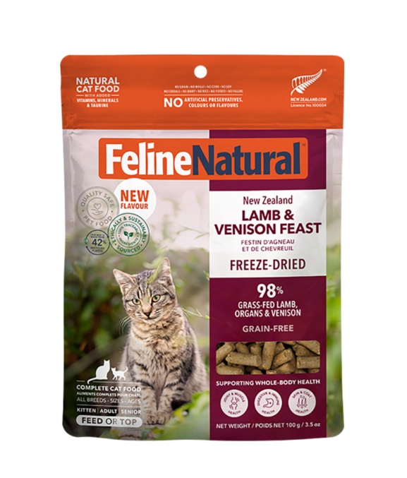 Have your cat try a little taste of New Zealand with Feline Natural Cat Food! This freeze-dried meaty cat food is inspired by the pure taste of the New Zealand wilderness! High in protein to keep your cat energized. Made with premium meats and nutritious GMO-free wholefood ingredients along with essential vitamins, minerals and oils. Try as a nutritious food topper! For all life stages. Made in New Zealand. Grain & Gluten-Free. No Artificial Additives.