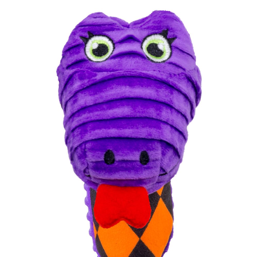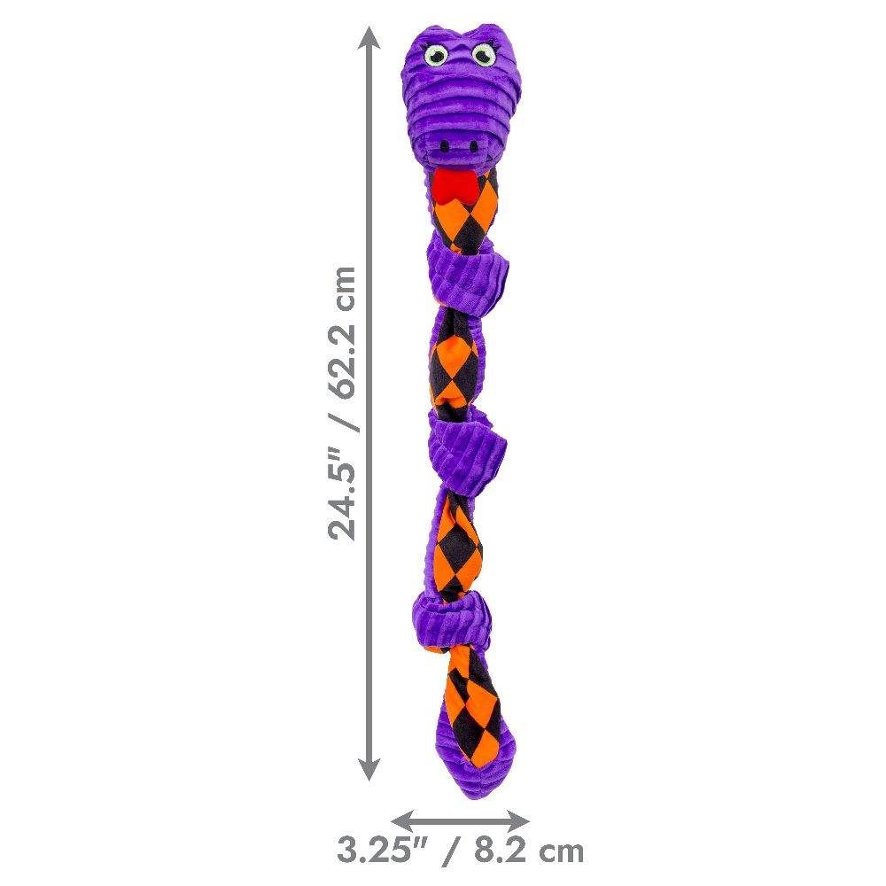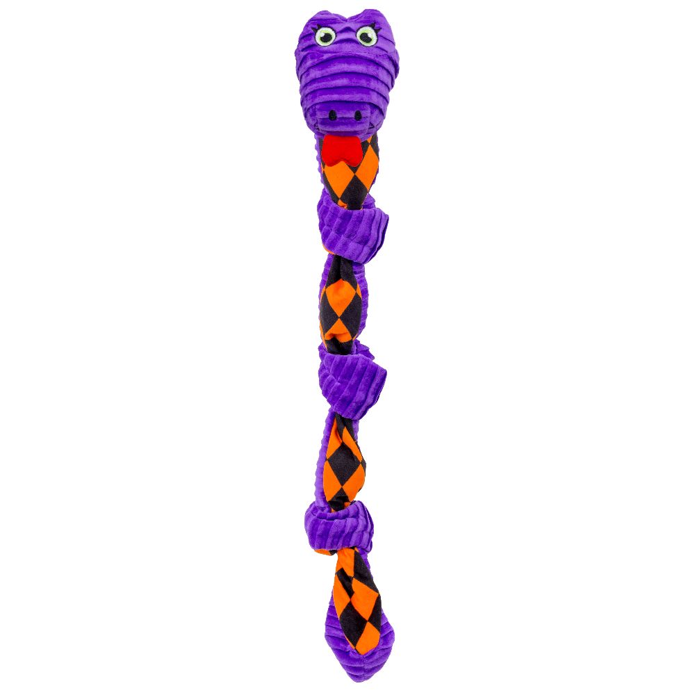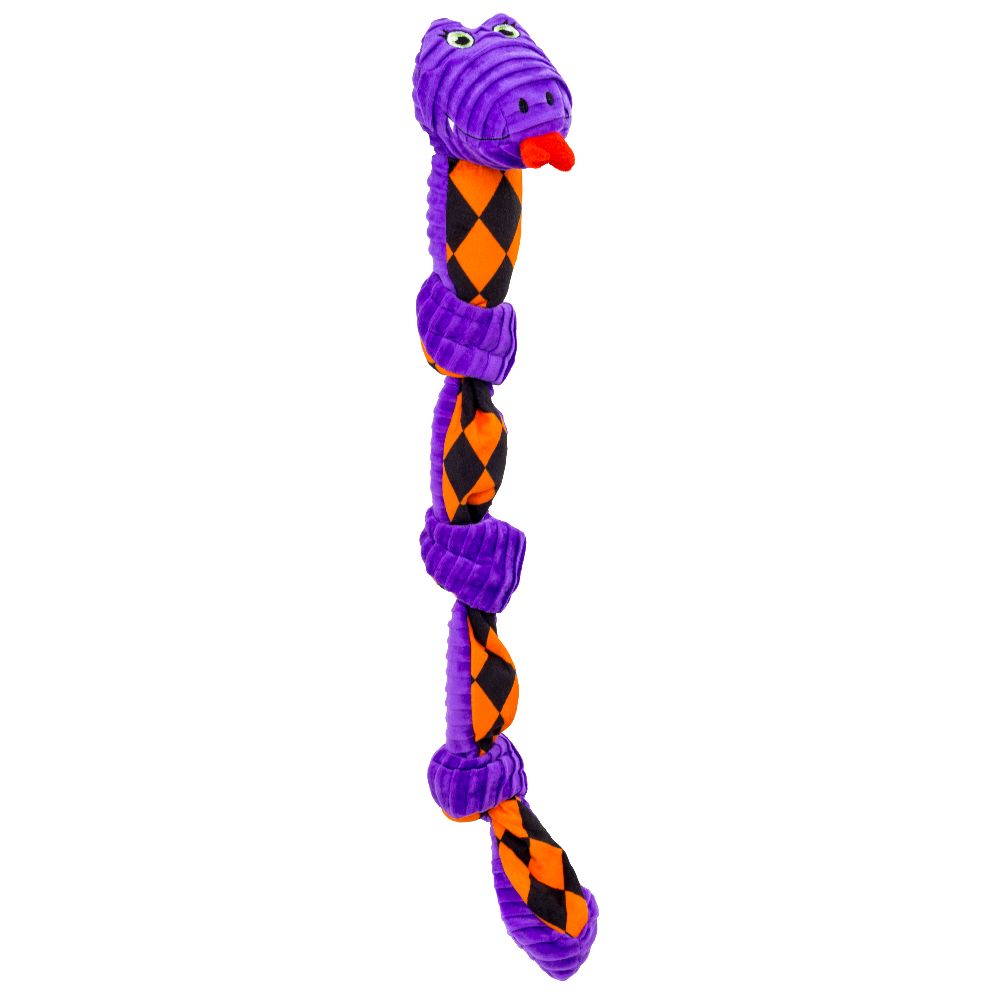 KONG Halloween Knots Snake has its knots all tied up and is ready to play all night long! This low-stuff plush snake is built to endure pulling and light chewing. It features an internal knotted rope that caters to dogs' playful instincts to thrash, tug, and wrestle. Varied textures and squeakers keep play sessions going, but this floppy friend is the perfect snuggle buddy when naptime comes. Our adorable snake makes a fantastically floppy trick-or-treating companion, allowing your dog to join in on the spooky fun.