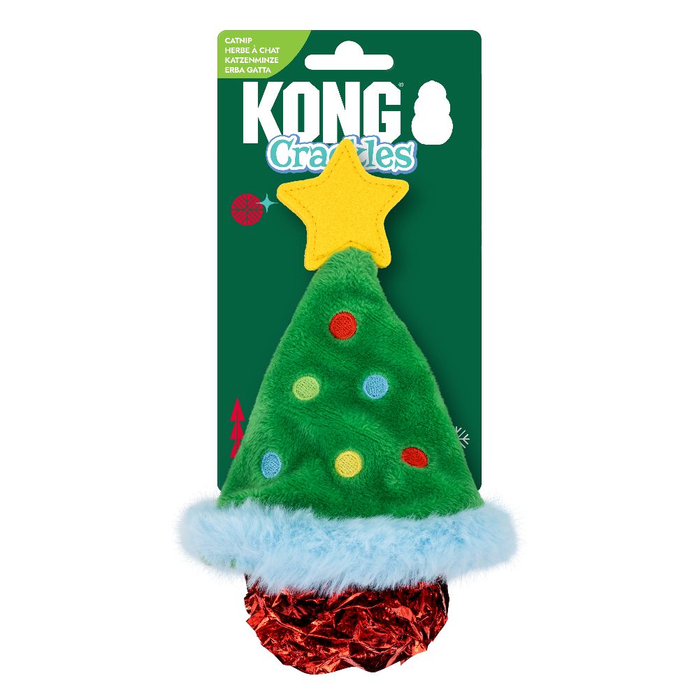 KONG Crackles Christmas Tree brings chasing, batting, and capturing fun to the holiday season! A tethered crinkling ball inside the tree makes irresistible crackling sounds that spark cats' hunting instincts and fill them with holiday spirit. Plus, it's loaded with KONG Premium North American Catnip to make play sessions even longer and livelier. With multitextured exteriors, this playtime present also makes a great snuggle buddy after a long play session. And thanks to its shape, this Crackle toy is easy for cats to pick up, play with, and wrestle all day. Whether your cat has been naughty, nice, or a little of both, Holiday Crackles Christmas Tree makes an ideal gift for curious cats, letting them join in on the seasonal fun.