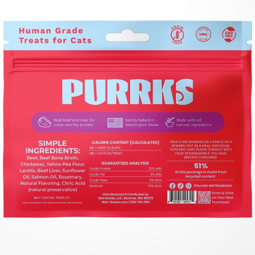 Purrks Beef Crunchies bring the crunch, the flavor, and the fun. Made with real beef and liver and gently baked for a clean, crispy bite, these crave-worthy crunchies deliver the rich protein cats love plus the goodness of beef bone broth to help support hydration and everyday vitality. Human grade ingredients and simple, purposeful nutrition come together to support healthy digestion and a soft, shiny coat, all in a bright, modern treat made for today’s cat.