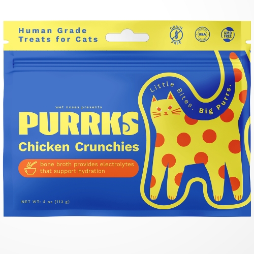 Purrks Chicken Crunchies bring the crunch, the flavor, and the fun. Made with real chicken and liver and gently baked for a clean, crispy bite, these crave-worthy crunchies deliver the protein cats love plus the goodness of chicken bone broth to help support hydration and everyday vitality. Human grade ingredients and simple, purposeful nutrition come together to support healthy digestion and a soft, shiny coat, all in a bright, modern treat made for today’s cat.