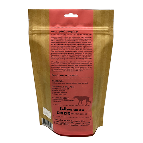 Ingredients: oat flour, rice flour, Alaskan salmon, eggs and lard.