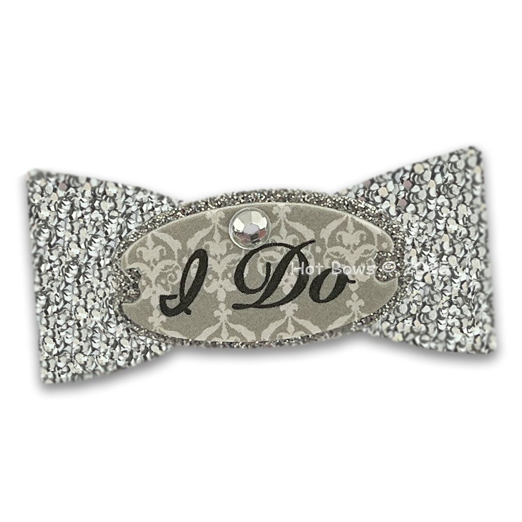 Those two special words "I Do"! On a silver glitter fabric with those two words centered with sparkly details. All silvers, grays, and ivory. Stiffened for extended wear, approx 2" wide.