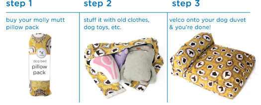 with the molly mutt pillow pack, you re-use old clothes, towels, or even old dog toys to add a stylish bolster to your dog's bed! durable, washable, and pre-shrunk, molly mutt pillow packs are 100% cotton, fully-zippered and sized to fit the short side of your molly mutt dog duvet.