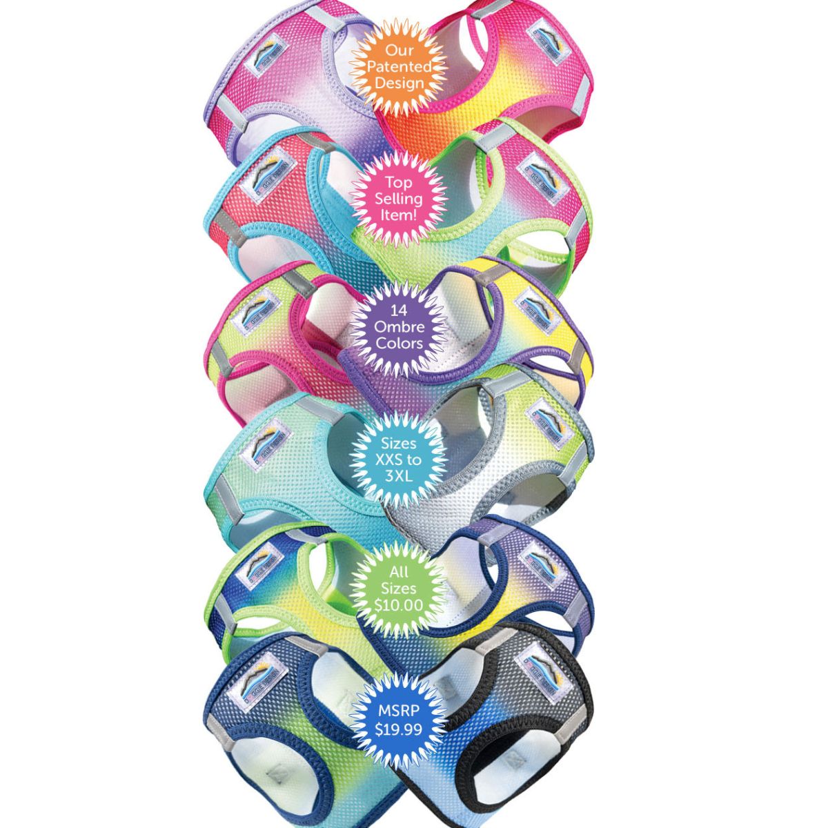 Our latest Patented “Ombre” American River Choke Free Harnesses. Doggie Design is the FIRST and ONLY company in the world to create this Exciting New Ombre Harness Design. We used our own special color blending technique to create a beautiful Palette of Rainbow Colors.