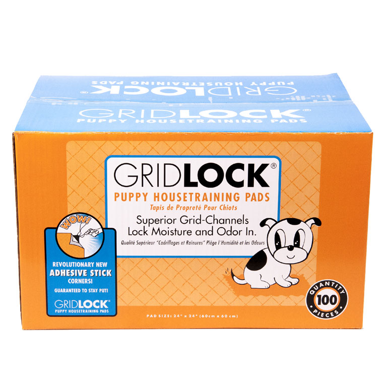 GridLock® housetraining pads channel moisture away from the surface and return to dryness in seconds. A special scent attracts your pet, making housetraining easy. The advanced technology antibacterial polymer absorbs and traps liquids, and the leak-proof plastic lining and sealed edges prevent damage to floors and carpets and ensures easy clean up. GridLock® Housetraining Pads absorb over 100 times their weight in liquid and still stay dry. No more wetness – no more odors – no more tracks.