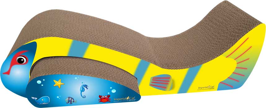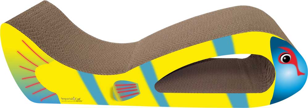 The Purr Fish is a two-in-one nesting scratcher combo that features sleek curves designed for scratching and snoozing. Attractive, modern design complements home décor. Made in the USA from recycled paper. Features a scooped top for napping and a tunnel area for play. Big size is great for homes with multiple cats. Bag of Pure, All-Natural catnip included.